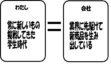 わたしは、常に新しいものに挑戦してきた、御社は業界に先駆けて常に新商品を生み出し続けている。 2者の間には、「新しいモノ」という共通点がある。